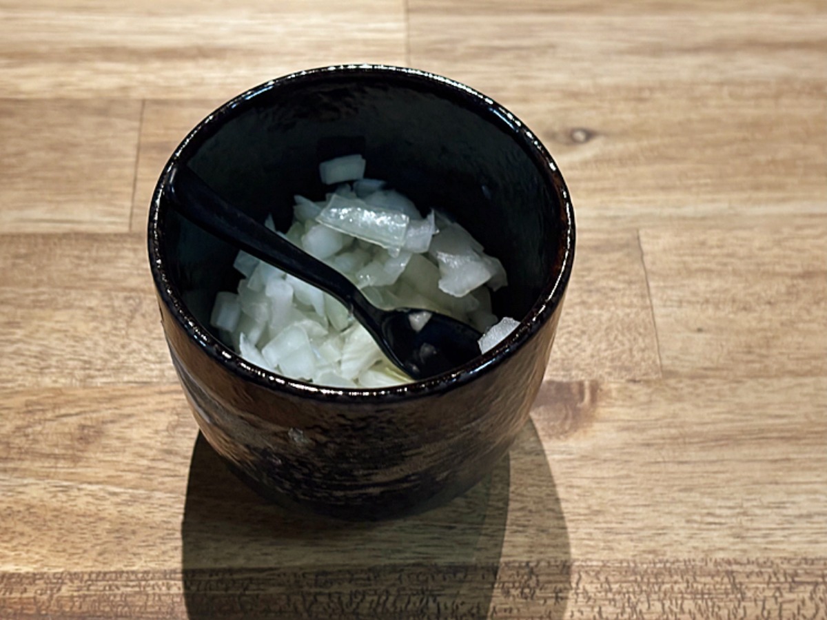 まずは、薬味の玉ねぎを入れます。粗目のみじん切りが嬉しいですね。