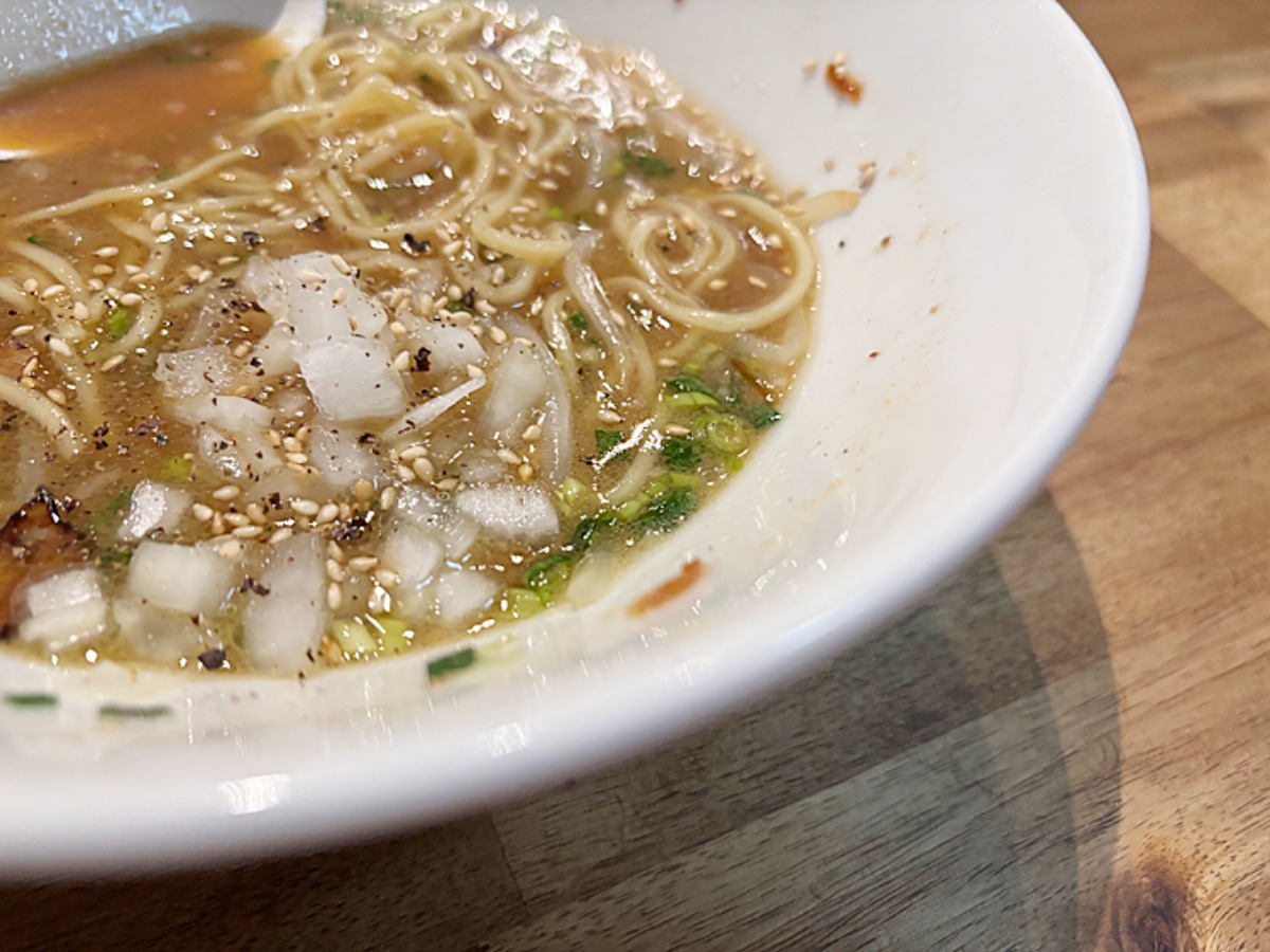 塩ラーメンは透明感のあるイメージでしたが、我央さんの塩ラーメンは茶色っぽく、味も濃いめで食べ応えがありました。
