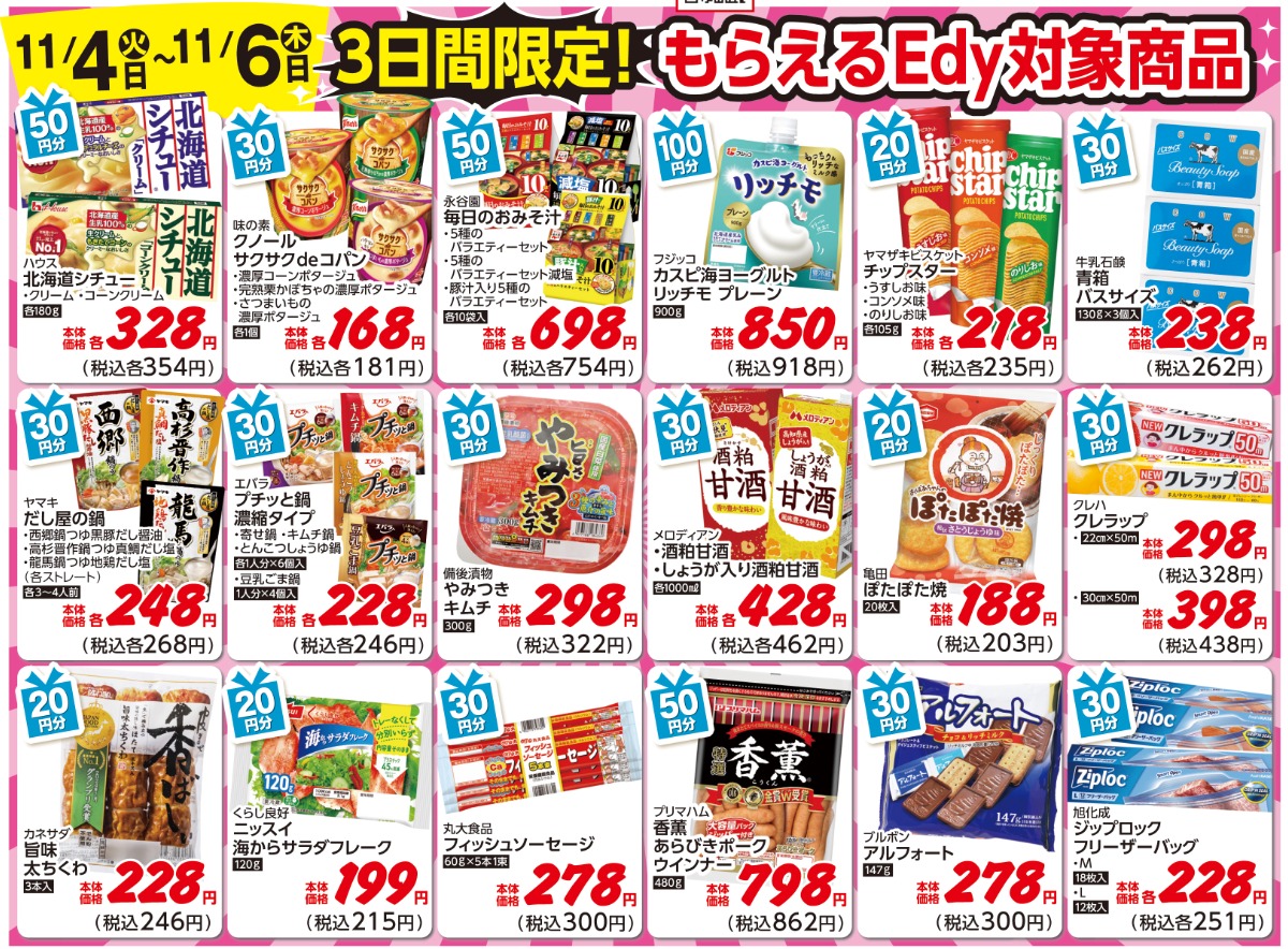 11/4(火)~11/6(木)3日間限定!もらえるEdy対象商品
