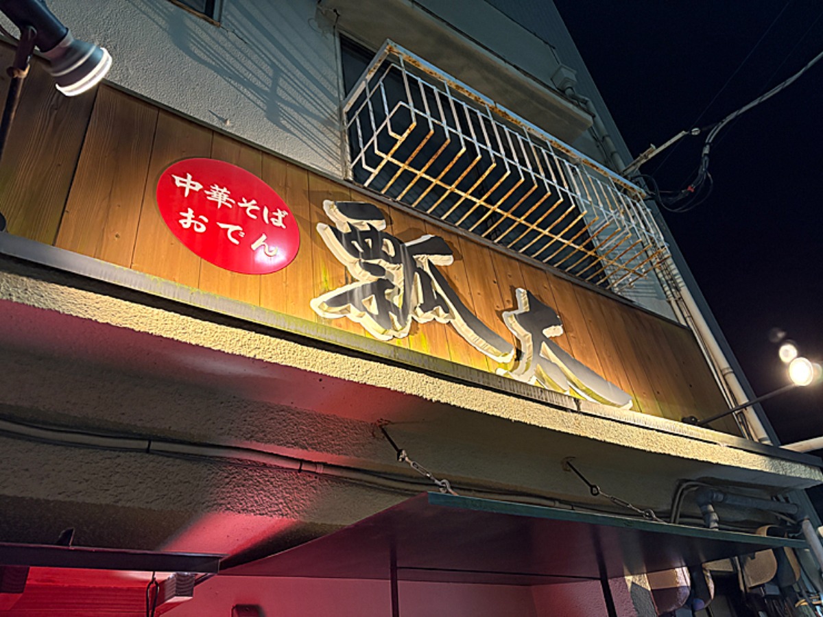 夜の街に浮かぶ看板には「中華そば」と「おでん」の文字。