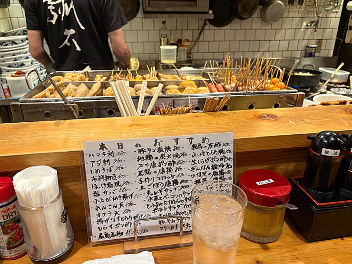 カウンターの目の前には大きなおでん鍋があり、出汁の香りがふわりと広がります。