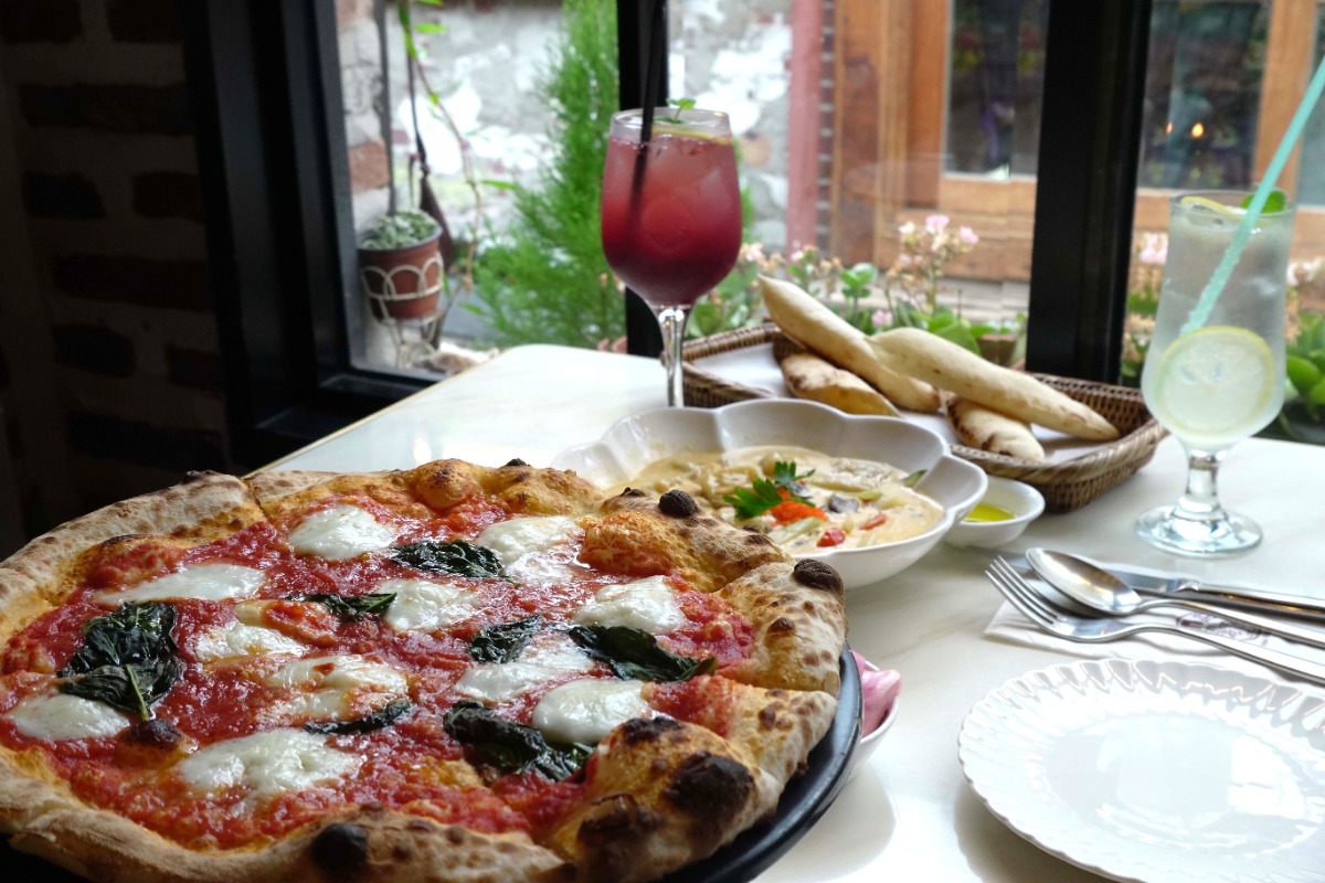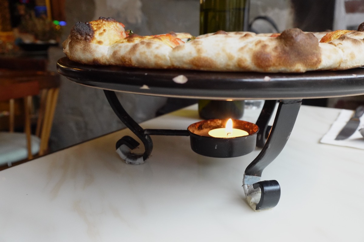 窯焼きピザは温かなプレートにのせられ、熱々のまま味わえます!