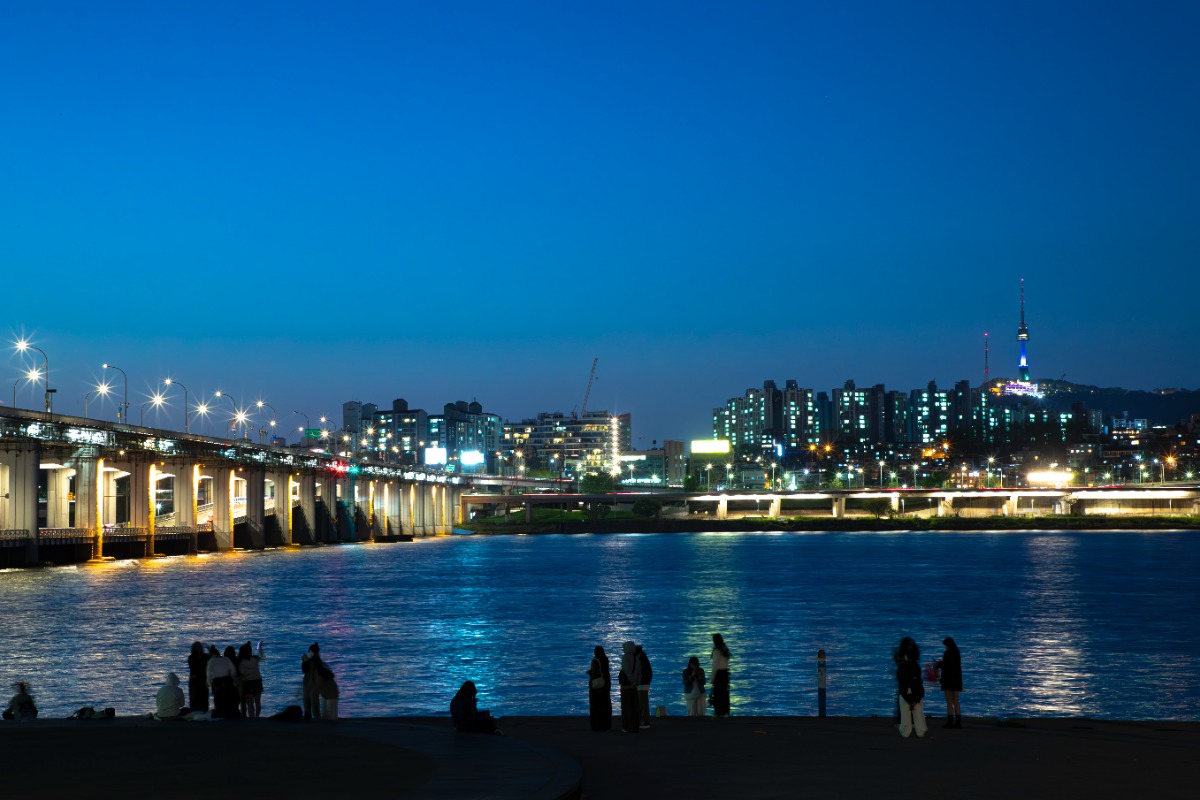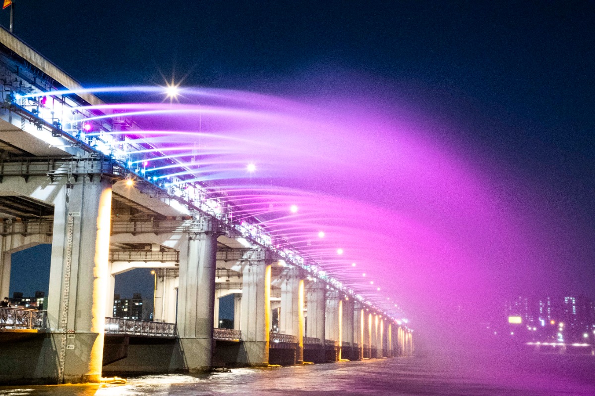 漢江(ハンガン)の盤浦大橋(パンポデギョ)では、決まった時間に始まる約20分の噴水ショーが人気。4~10月末まで毎日開催しており、夜はレインボー噴水が幻想的で映画やドラマの撮影場所にもなっています。