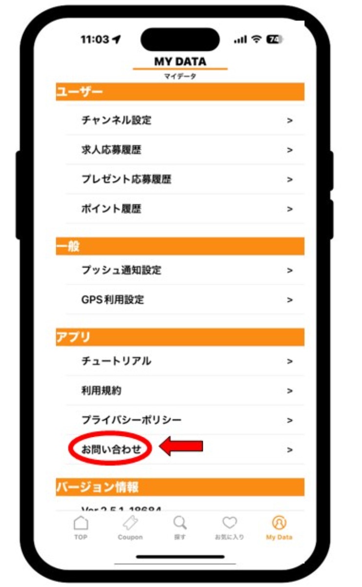 アプリを開いて、下メニューの「My Data」 →【バージョン情報】をタップして、表示される 「_(アンダーバー)」より後ろの番号(ユーザーID) を「お問い合わせ」から教えてください。