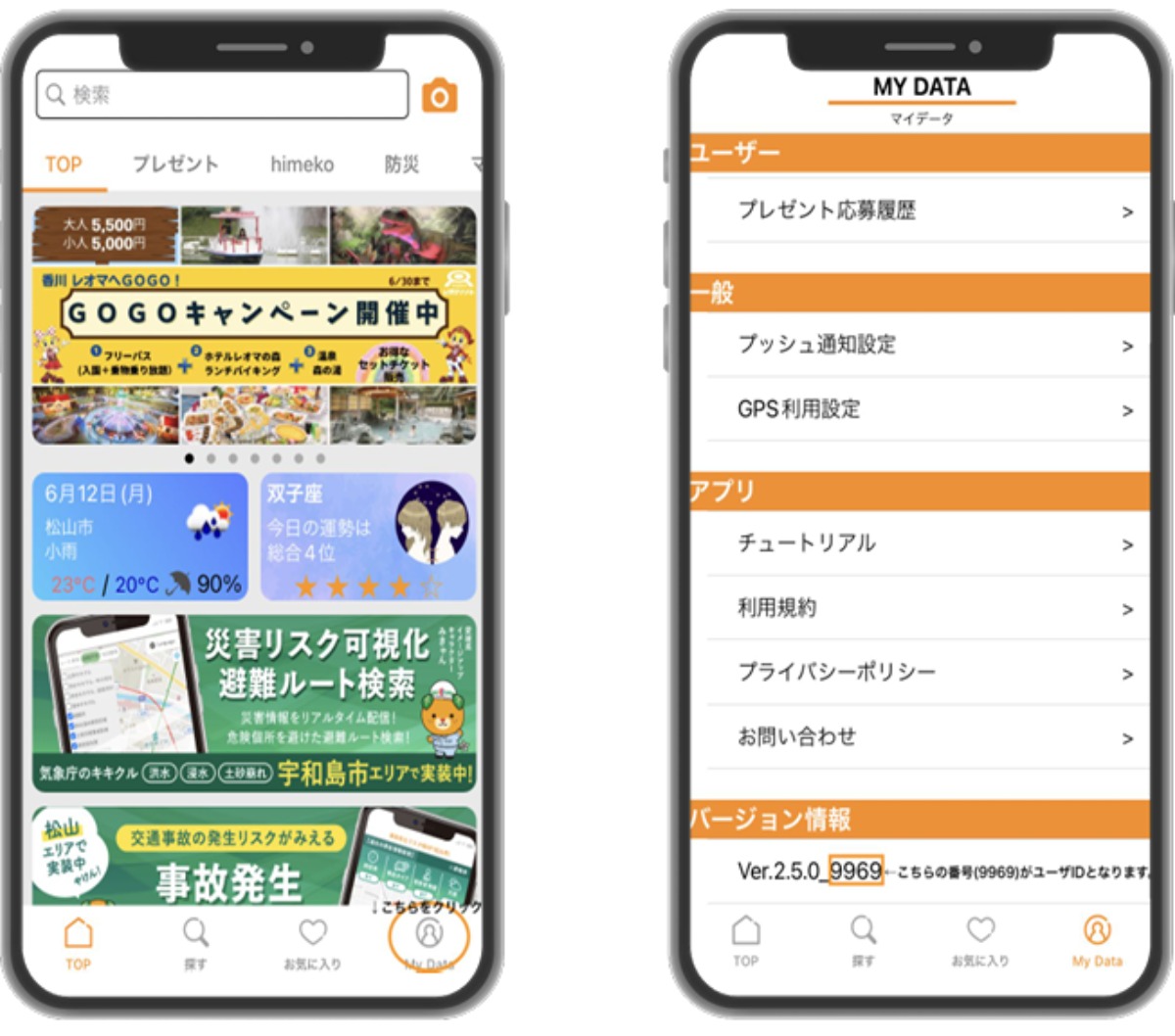 新しい端末にも「えひめのあぷり」をインストールしていただき、同じく 「My Data」 →【バージョン情報】 を開いて、アンダーバー以下の番号(ユーザーID) を「お問い合わせ」から教えてください。