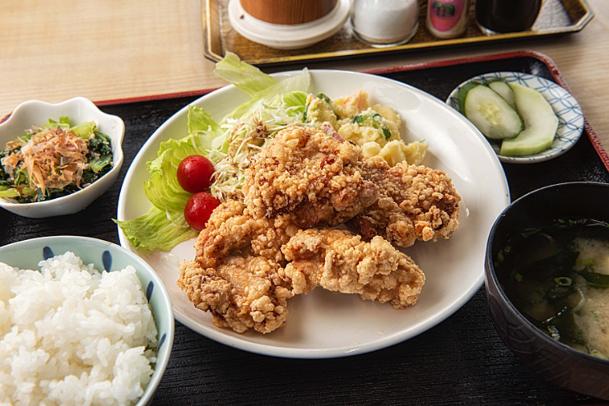 一番人気の定食。ニンニクが 効いた下味しっかりの唐揚げに添えられたポテトサラダも◎