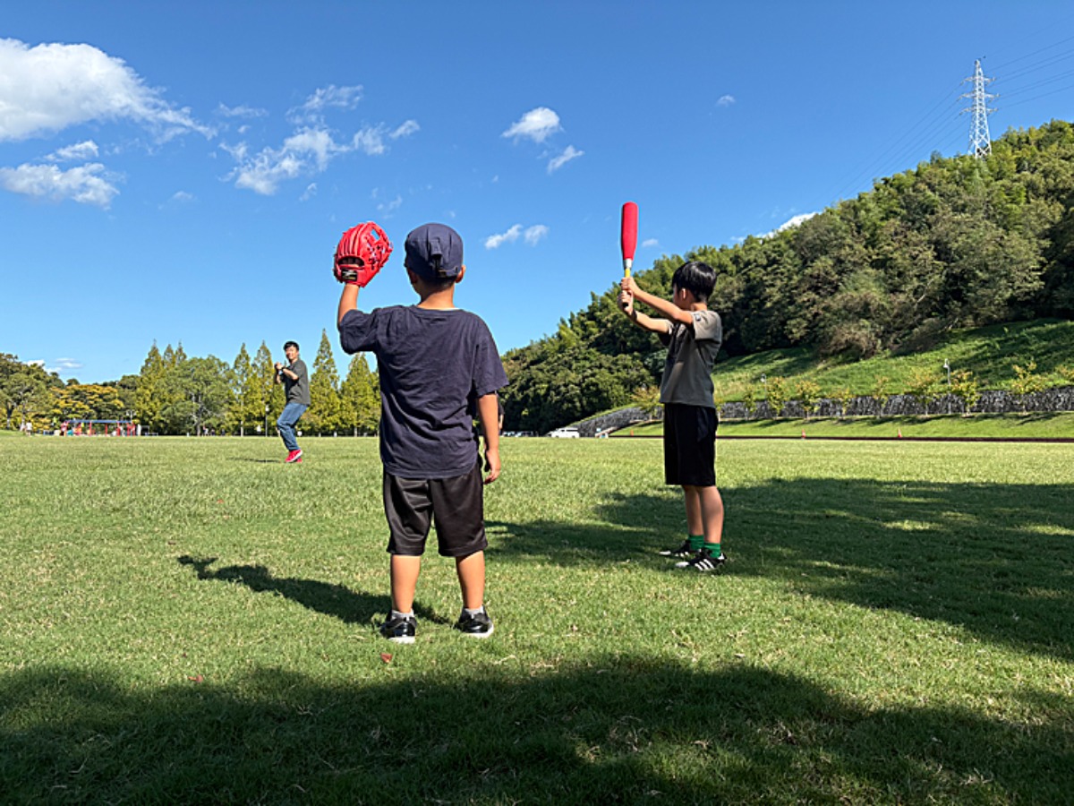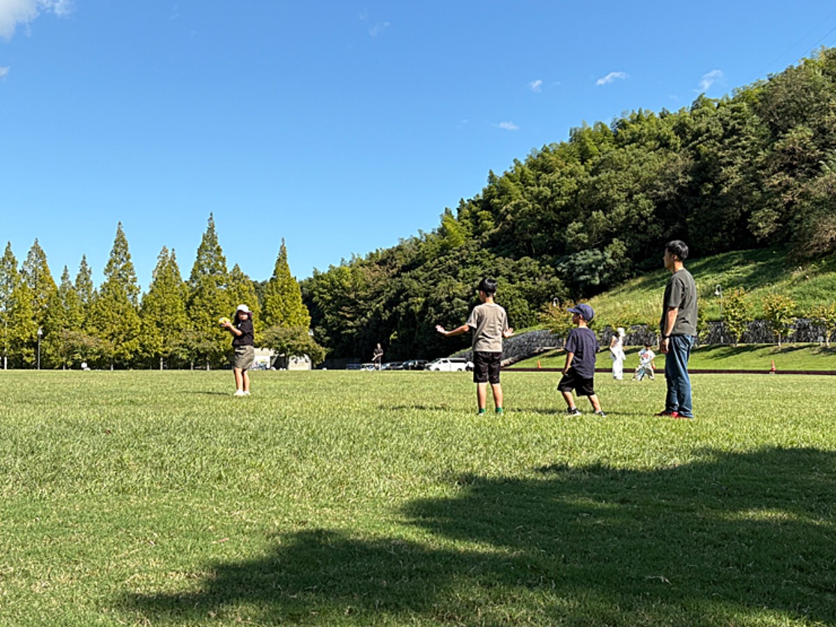 目の前いっぱいに広がる芝生広場は、どこを見ても緑が美しく、子どもたちは走り回ったり、ボール遊びをしたりと、思いっきり体を動かして大はしゃぎ。