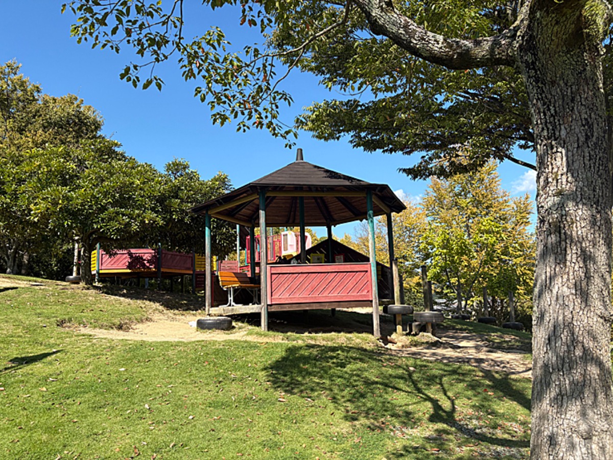 芝生広場を進んでいくと、カラフルな遊具が見えてきました。
