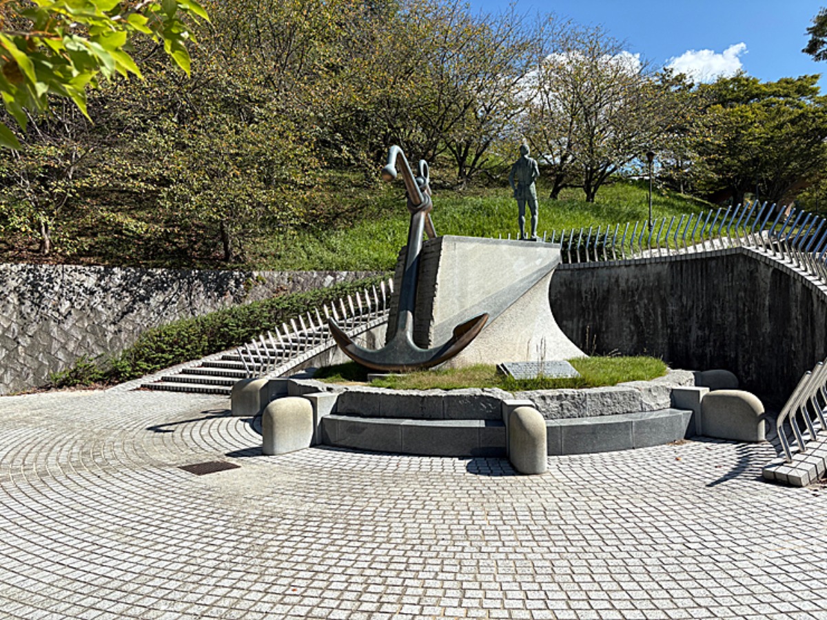 船のいかりをかたどった印象的なモニュメントは、子どもたちも興味津々。