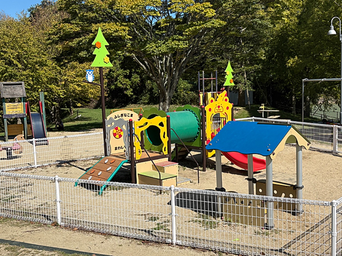 小さい子ども用の遊具。柵に囲まれているので安心。