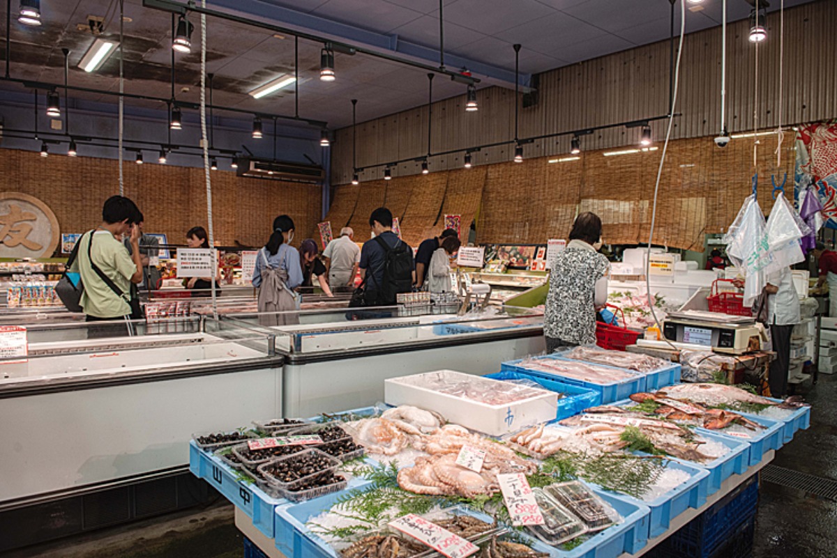 鮮魚市場に併設した食堂で10種類以上の旬の魚を使った海鮮丼や豪華なウニ丼がリーズナブルに味わえると評判の「マルトモ水産」。