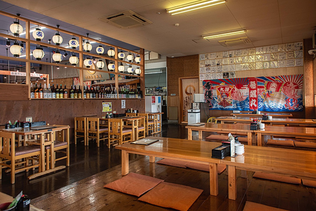 食堂内は大漁旗や西条ならではのだんじり提灯が飾られている。地酒の取り揃えも充実