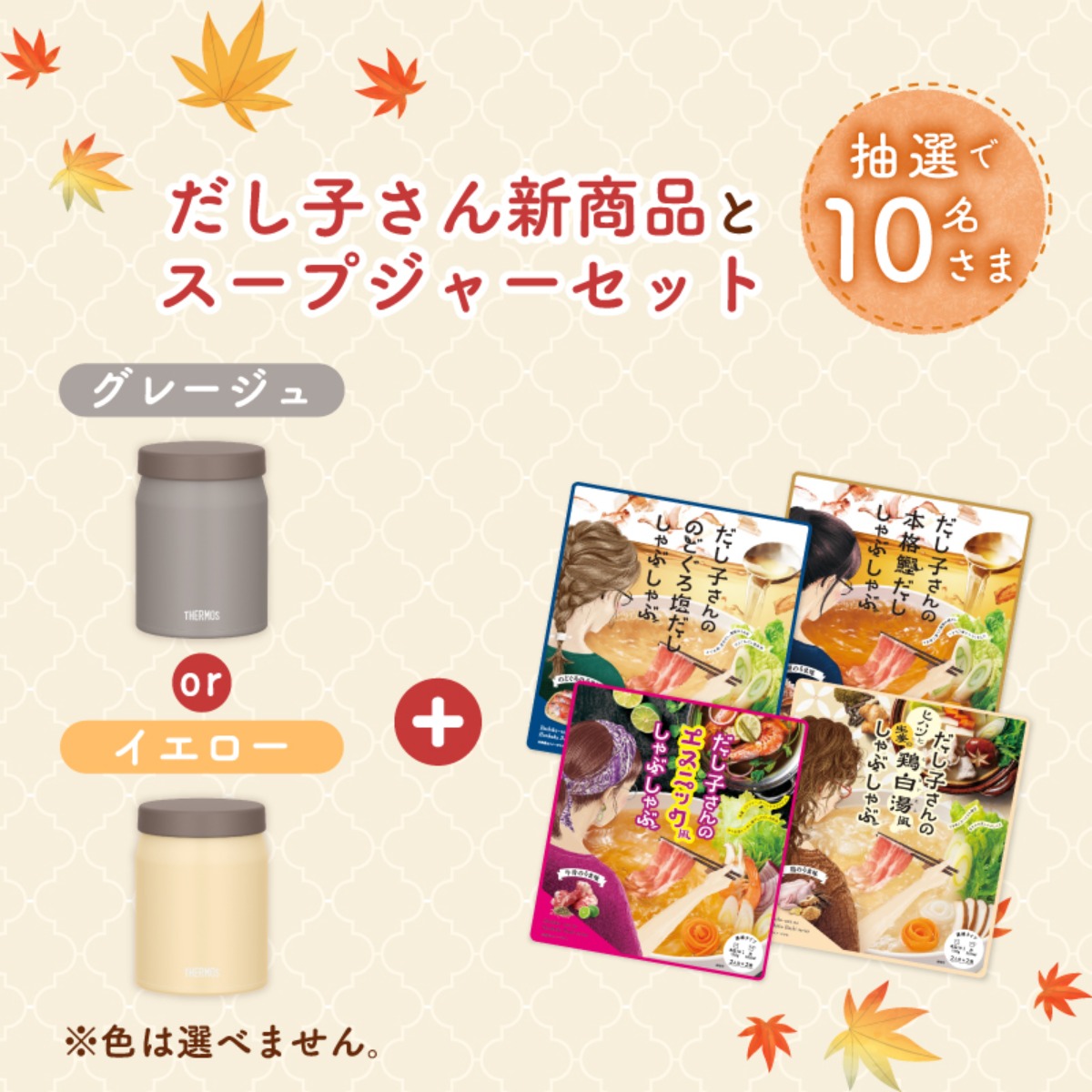 今回は、『だし子さん新商品とスープジャーセット』を抽選で10名さまにプレゼントいたします!