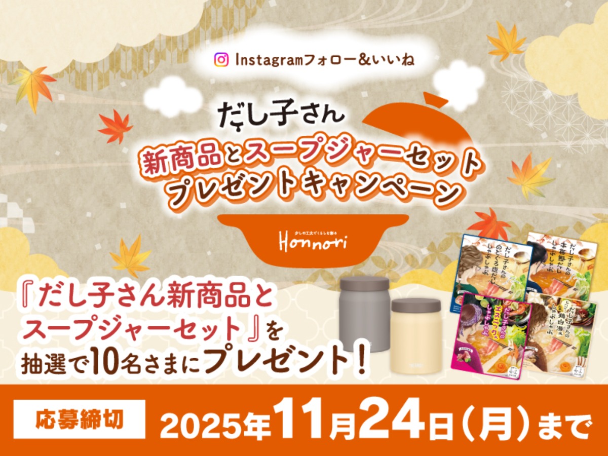 フジのWEBマガジンHonnori (ほんのり)のインスタグラム公式アカウントをフォローして、だし子さん新商品とスープジャーセットプレゼントキャンペーン投稿に「いいね」すると応募完了!
