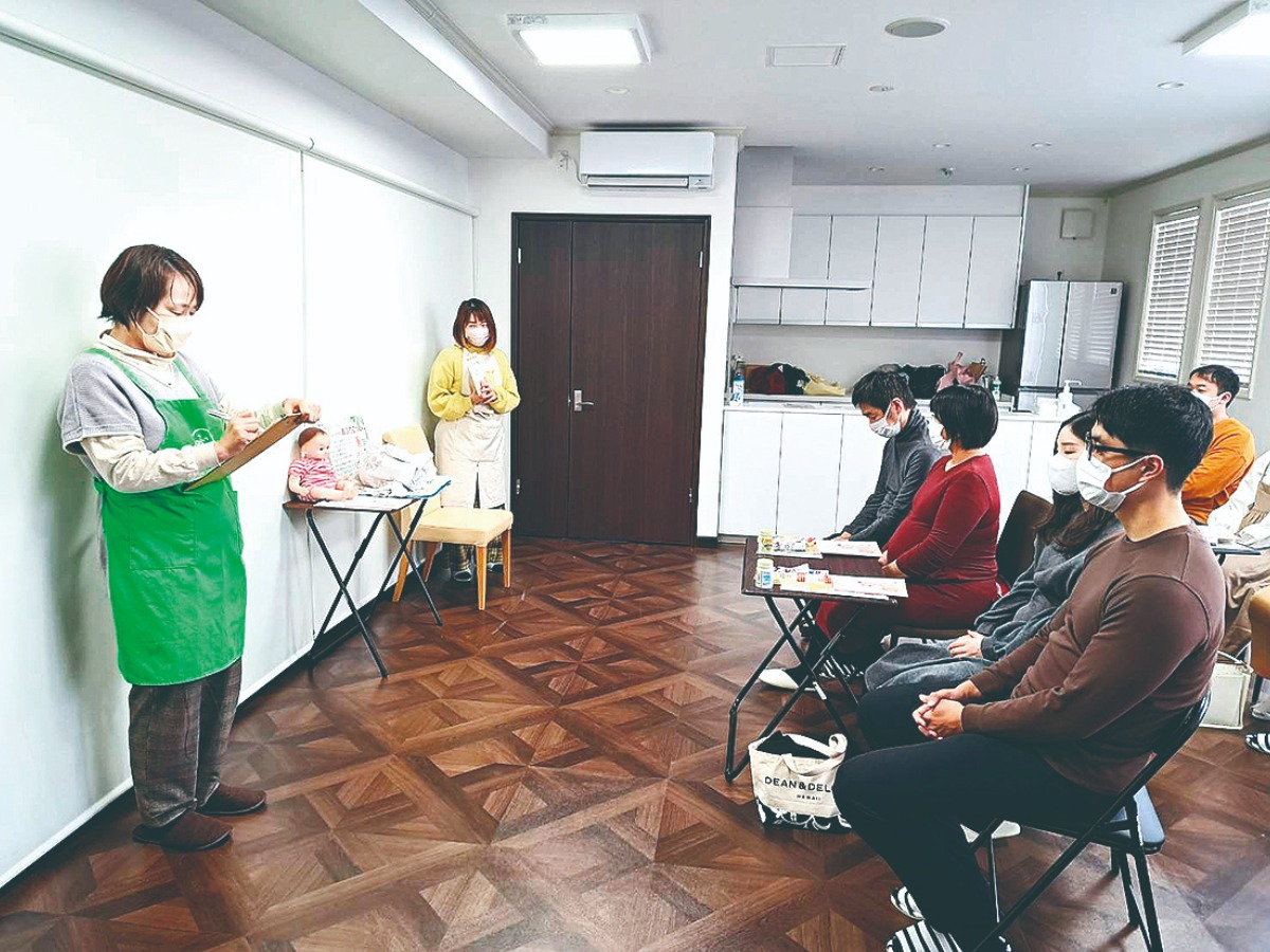 ▲おむつの替え方や沐浴の仕方が学べる保 健指導。希望者はパパも一緒に!