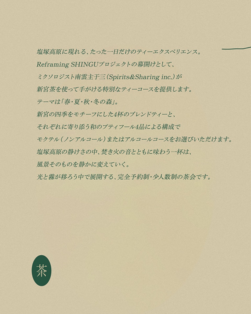 霧の茶会は、地域の新たな価値を引き出し発信する「Reframing SHINGU」プロジェクトの第1弾。