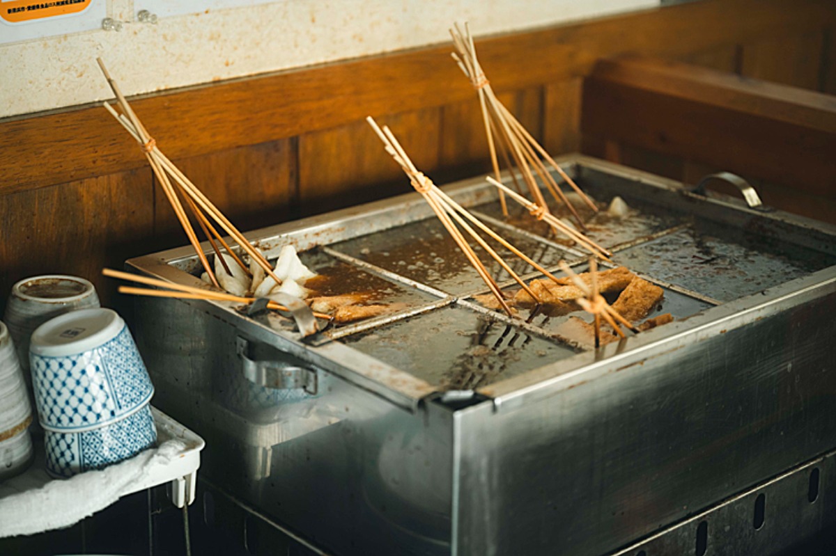 輪ゴムで縛っているものはまだ味が滲みていない おでん。この日は、ほぼ売り切れに