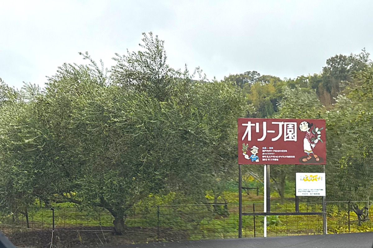 ナビ通りに進むと、看板と共にオリーブ畑が現れます。