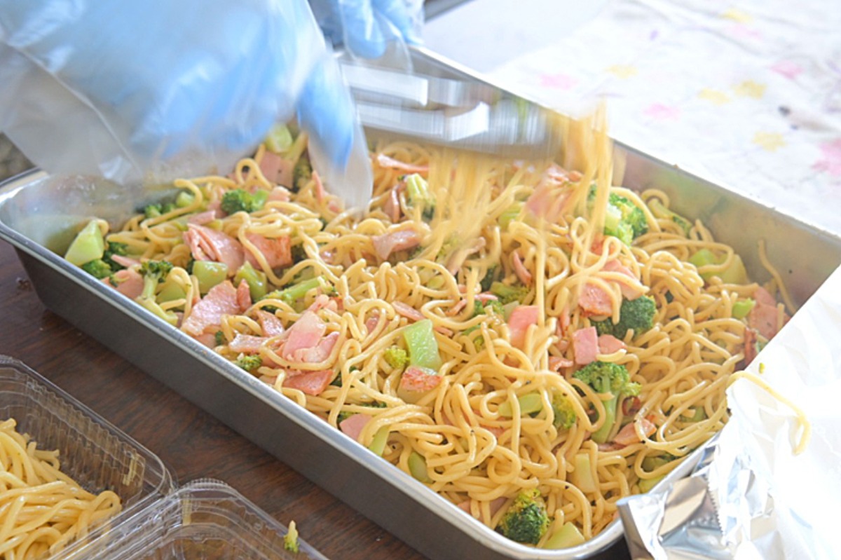 先生や学生さんのご厚意で、売り子体験をさせていただきました。美味しい焼きそばどうぞ!