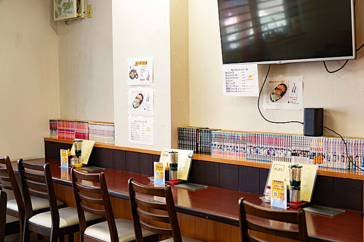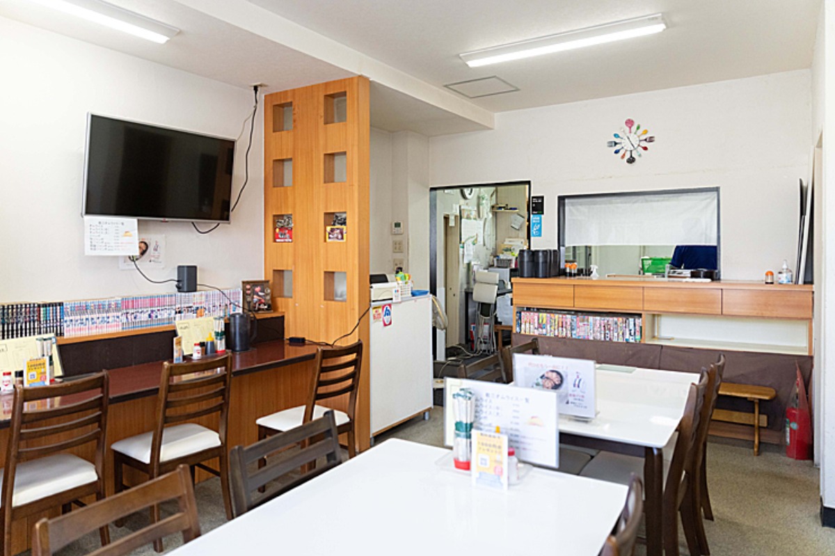 カウンター席も完備。テーブルには、さらにお得に利用できるクーポンの案内も置かれている