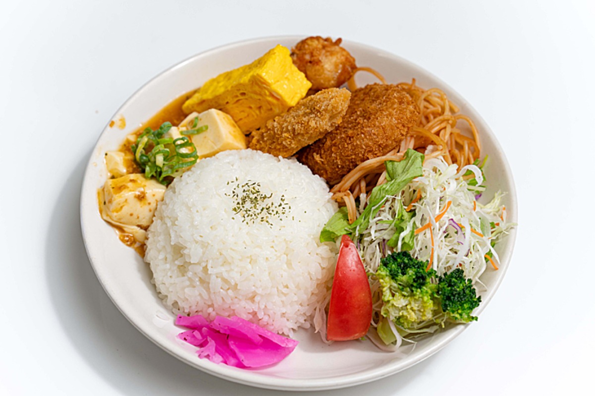 名物の唐揚げを含めた日替わりおかずとサラダ、ご飯がワンプレートになったボリュームランチ