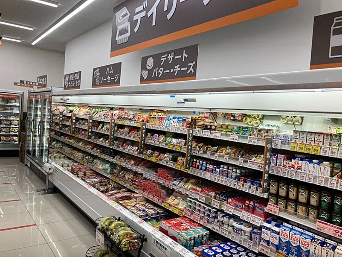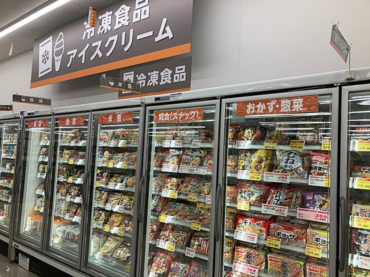 店内には、一般的な医薬品やサプリメントのほか、冷凍食品や牛乳・豆腐などの毎日使う食材がズラリ。