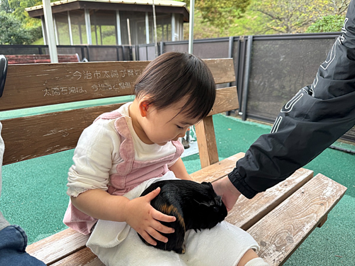 ふれあい広場では、娘が初めてのモルモットとの対面。