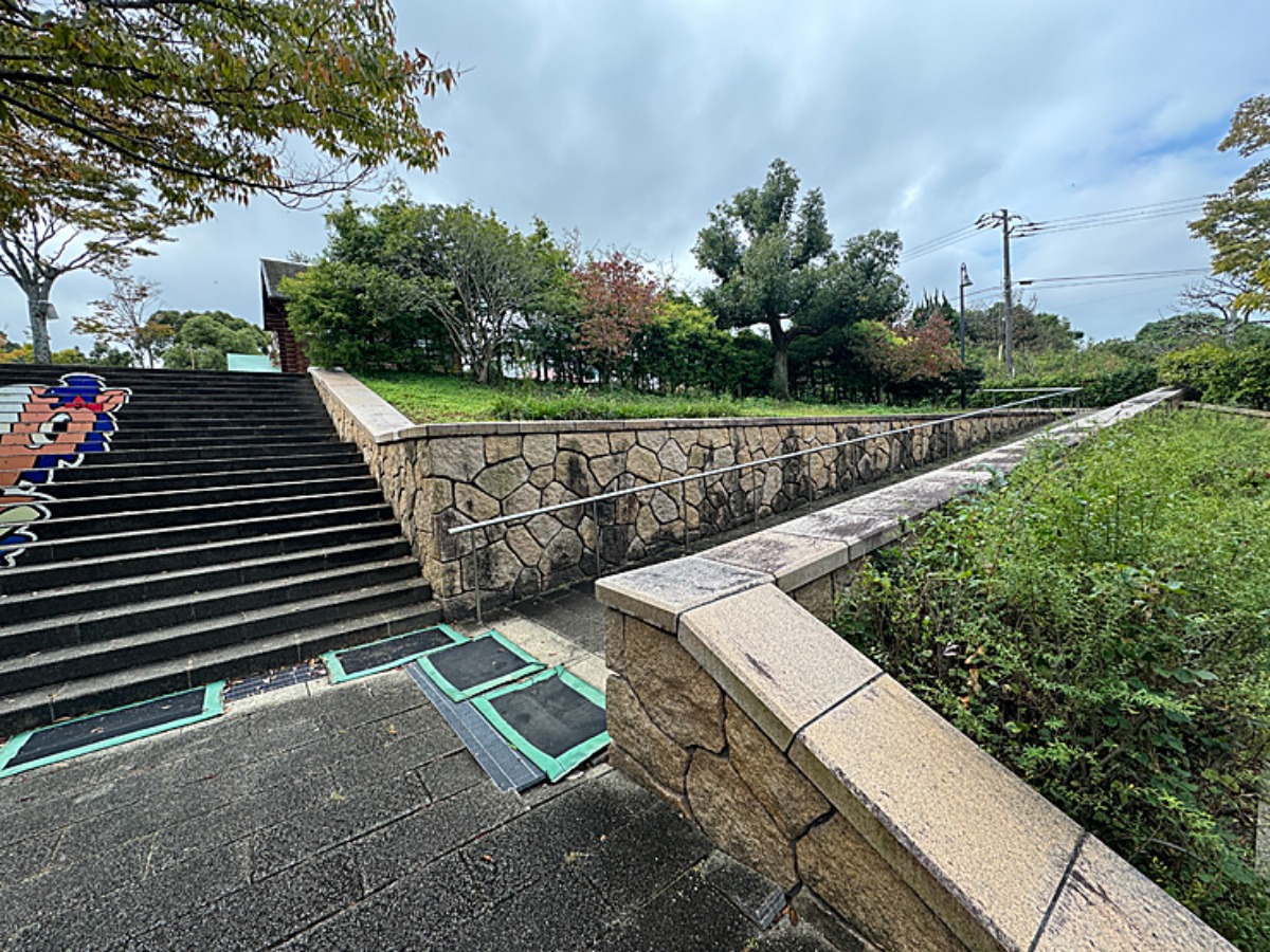 例えば駐車場は無料で広々。ベビーカーでも移動しやすいよう階段横にスロープが設けられており、途中にはトイレもあります。