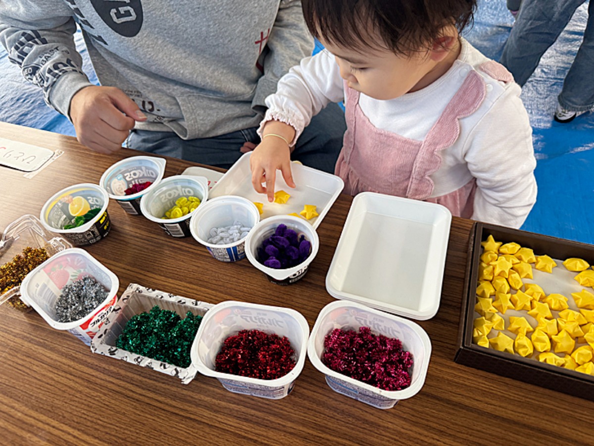 「おでかけ児童館」では、クリスマスツリー作りにチャレンジ。