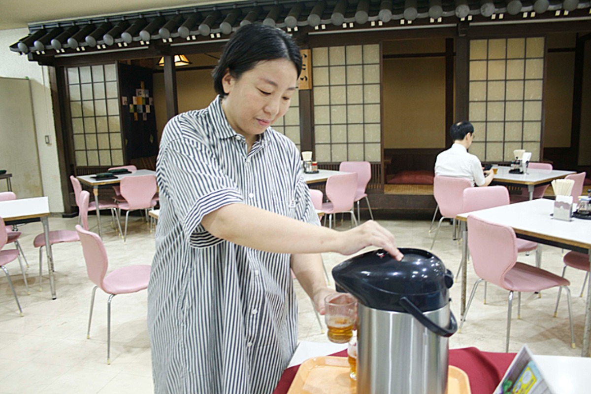 暑い季節は、県産はだか麦100%使 用の「はだかんぼう麦茶」を提供。水・ お茶はセルフサービス