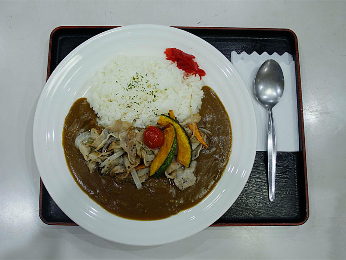 季節の野菜と豚バラ肉がのったカレー。甘さの後に辛さがしっかり感じられる