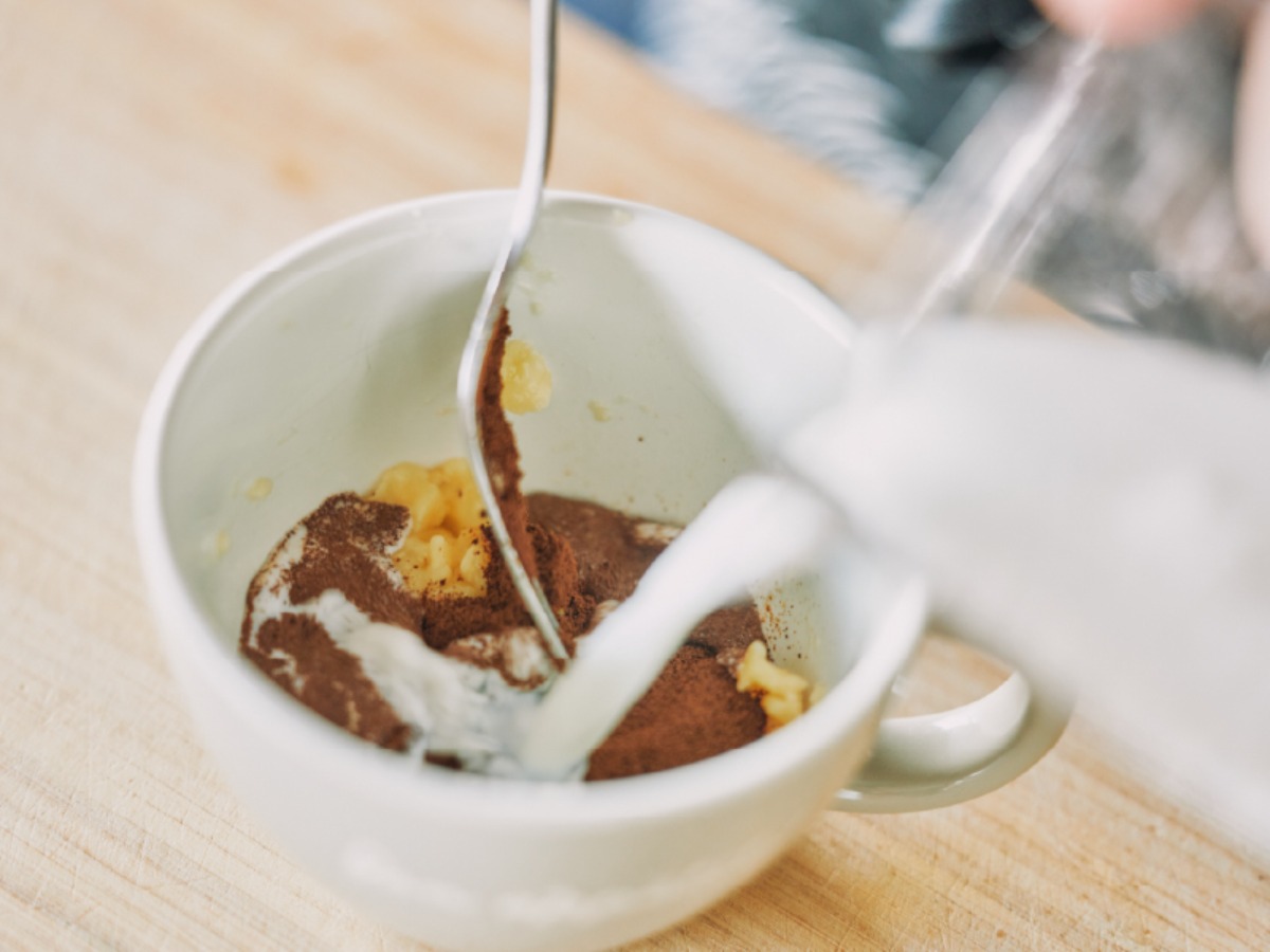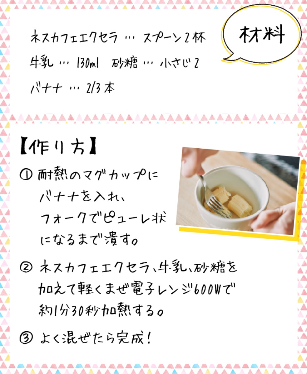カフェオレにバナナの甘さが優しくマッチ。レンジでチンするだけでできるので、時間がない朝の栄養補給としてもぴったりですよ。