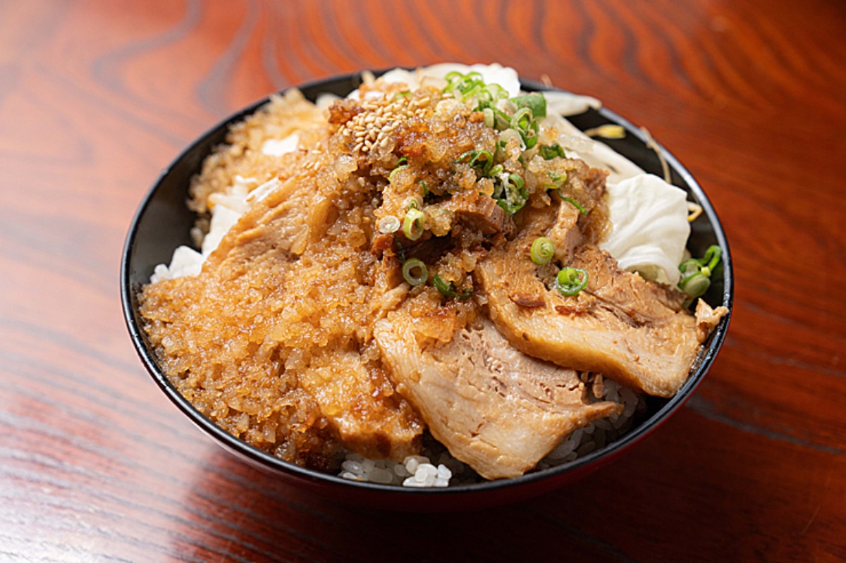 二郎系ラーメンにインスパイアされた厚切りチャーシューとモヤシ、 背脂たっぷりの丼