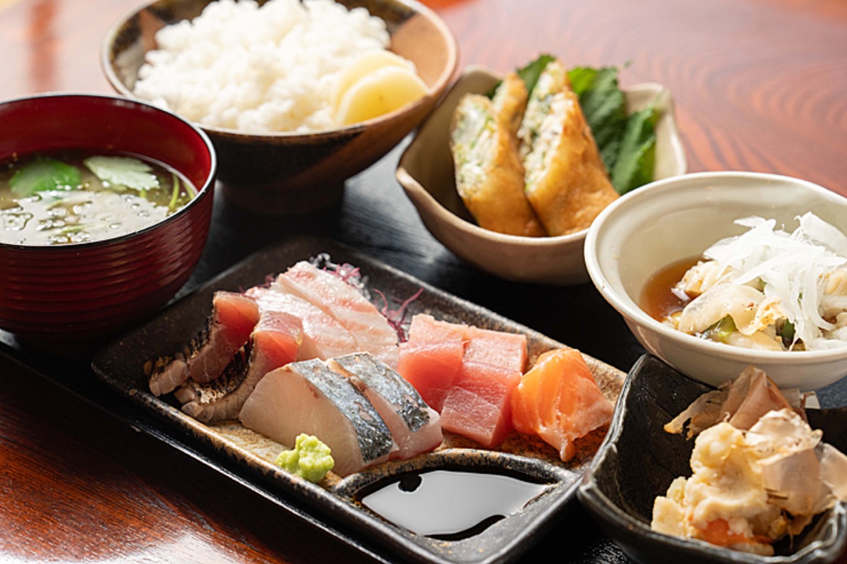 刺身5種、その日のおばんざい2種、 味噌汁、小鉢、香の物のセット。竹 (1.760円)・梅(1,210円)もあり