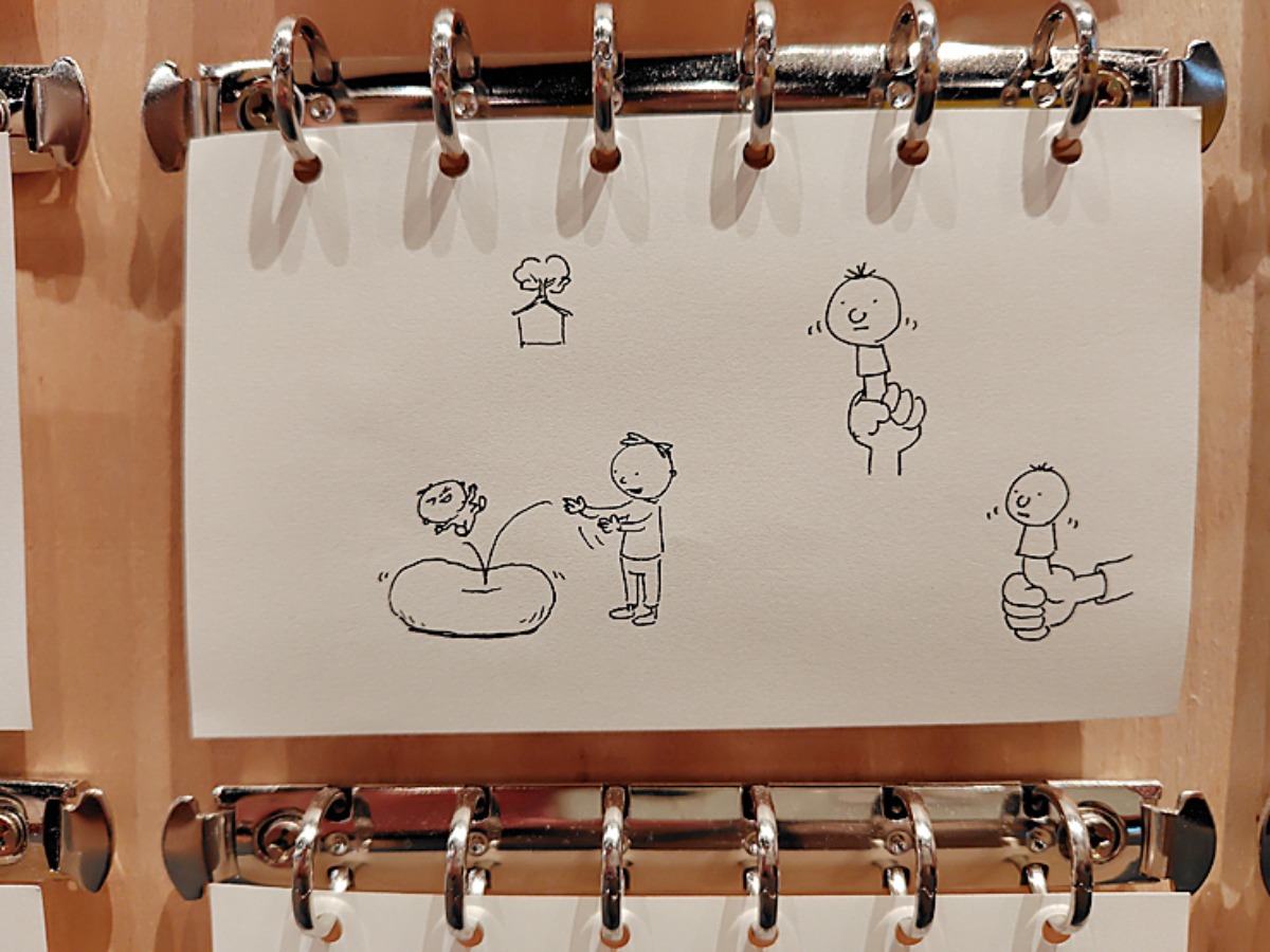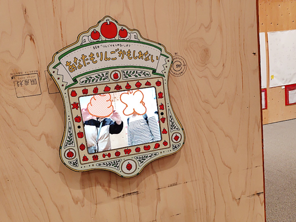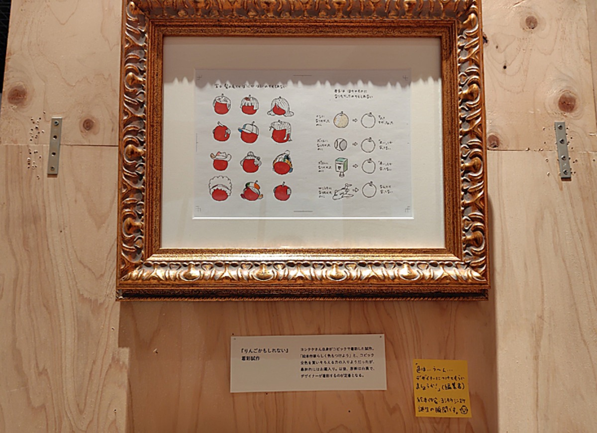 アイデアスケッチや原画以外にも、絵本のデザインを使った大型の展示の他、「うるさいおとな」にりんごを投げるコーナーや、映った自分の顔がりんごに変身するというモニター、ボタンを押して「おまじない」を作るコンピューター(?)など楽しい展示物がありました。