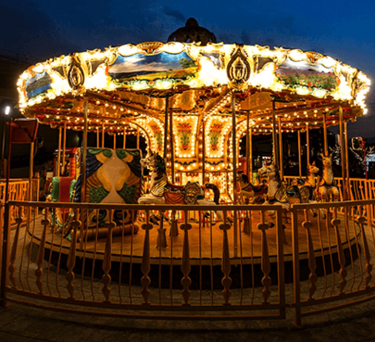 愛媛でここだけのメリーゴーランド「エミリー」は、10:00~20:00(19:55最終受付)で運行し、ライトアップされた美しい姿は子どもたちだけでなく大人にも人気。
