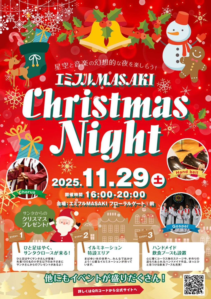 また、11月29日(土)には「エミフルMASAKI★Christmas Night★」が開催され、16:00~20:00の間はフローラルゲート①前広場でサンタクロースから先着100名の小学生以下にプレゼントが配布されるなど、心温まる特別企画も盛り込まれています。