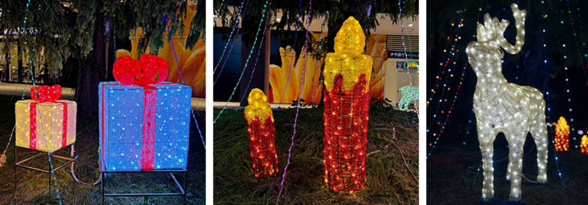 各ゲート前ではトナカイやプレゼント型の可愛らしいイルミネーションが並び、特に国道56号線側のフローラルゲート前は、家族や友人との記念撮影にぴったりの撮影スポットとして注目されています。