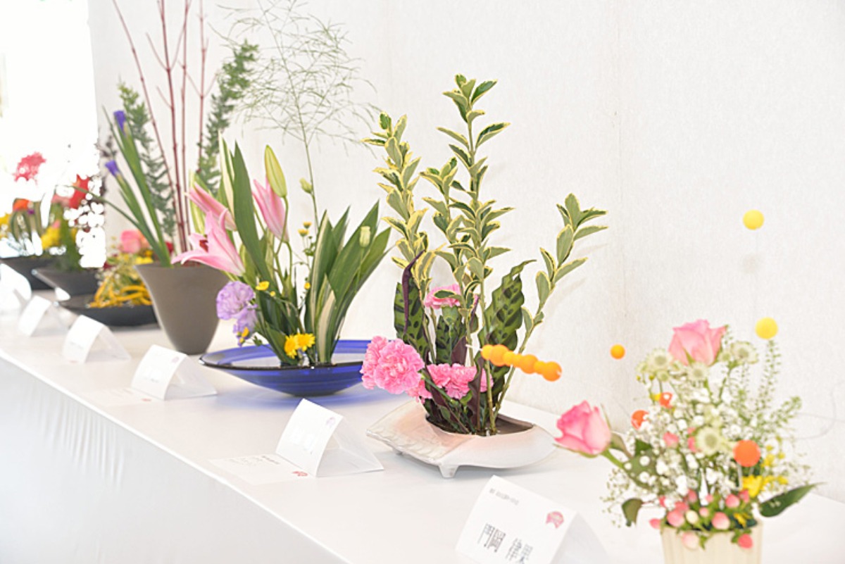 展示エリアでは、いけばなの展示もあり、花々の色合いや構成の美しさから、子どもたちの豊かな感性が感じられます。