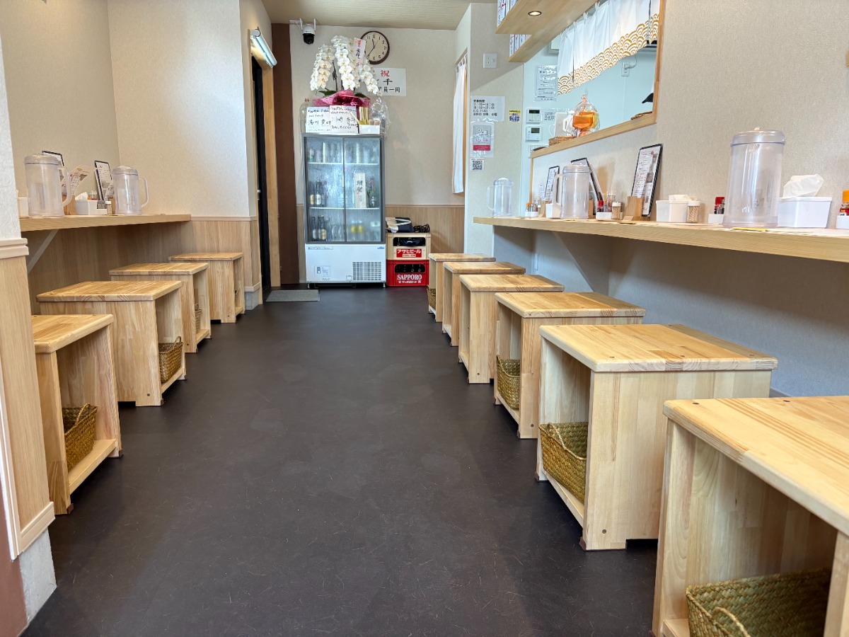 店内はカウンター7席のみのシンプルな造りですが、席の間隔をゆったりと取っています。