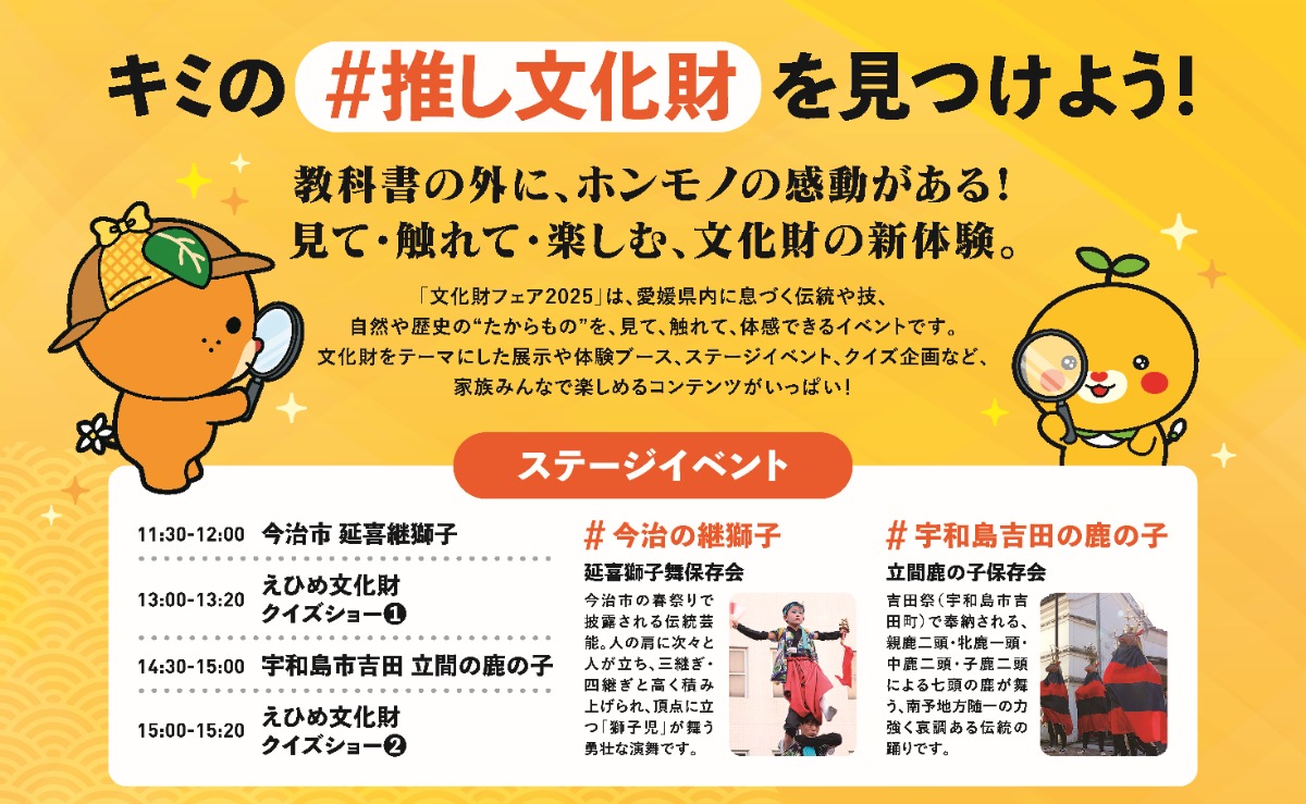 会場ステージでは、今治市の「延喜継獅子」や、宇和島市吉田の「立間の鹿の子」など、迫力ある伝統芸能のパフォーマンスが披露されるほか、家族みんなで盛り上がれる「えひめ文化財クイズショー」も実施。