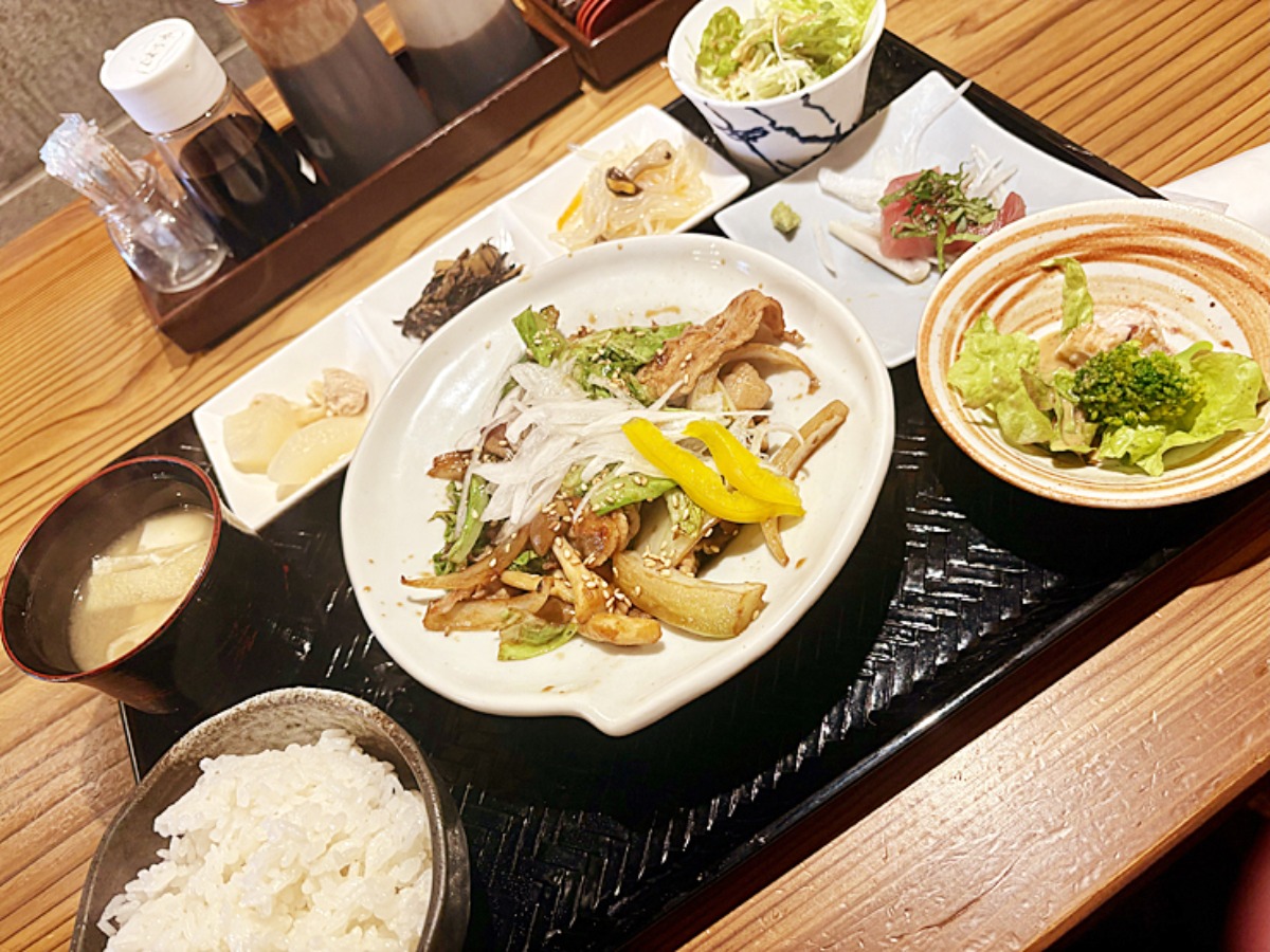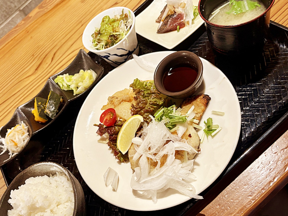 昼定食はメイン料理に副菜3品・刺身・サラダ・みそ汁・白ご飯付きでなんと税込み1,000円!