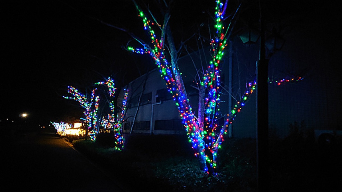 屋外の河川敷では、木々や建物がカラフルなイルミネーションで飾られ、川辺が一面まばゆい光の世界に変身します。