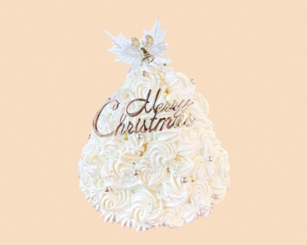 甘さをぐっと抑えたたっぷりの生クリームで真っ白なツリーを表現した、シックでおしゃれなクリスマスケーキ。