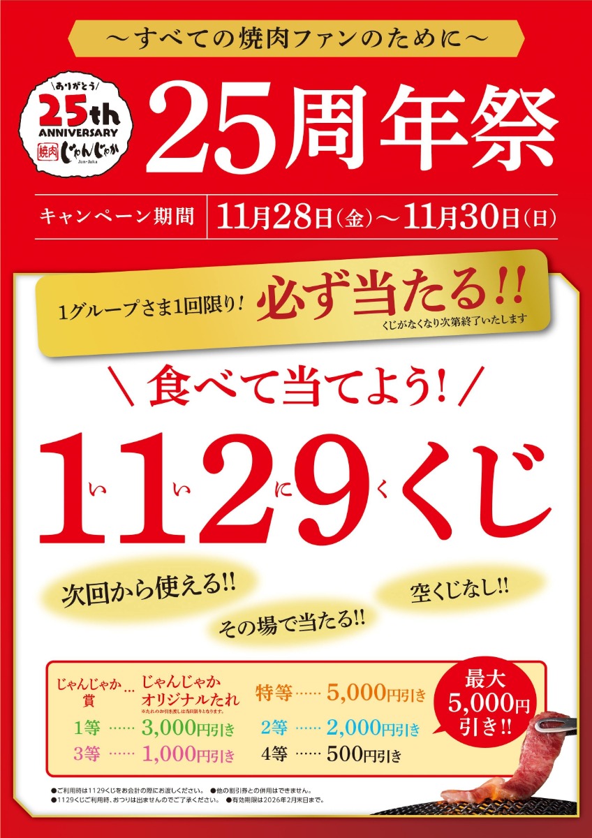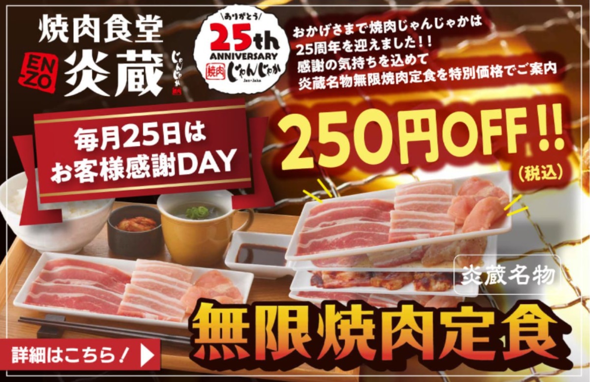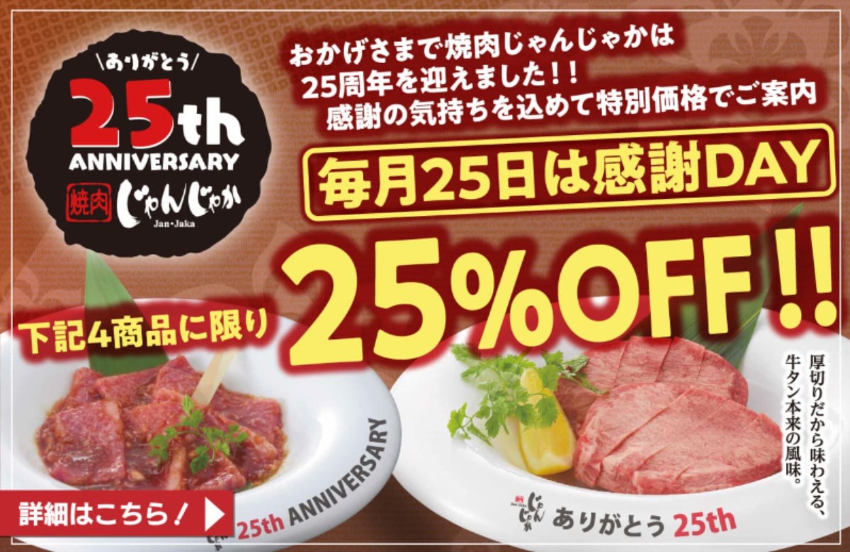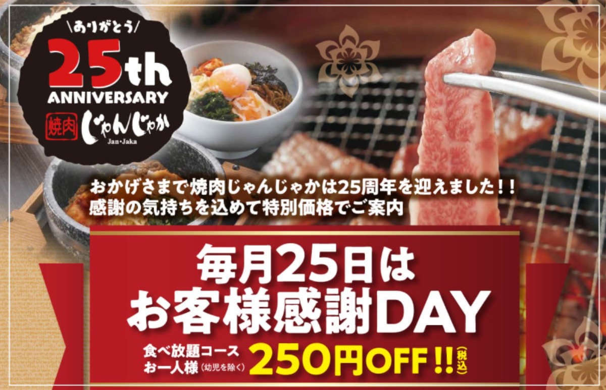 焼肉じゃんじゃか25周年感謝祭!毎月25日はお客様感謝DAY
