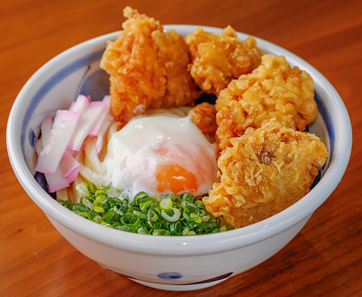 大きな鶏天が4つのったボリューム満点の人気メニュー。甘めのぶっかけダシでさらに食欲UP!