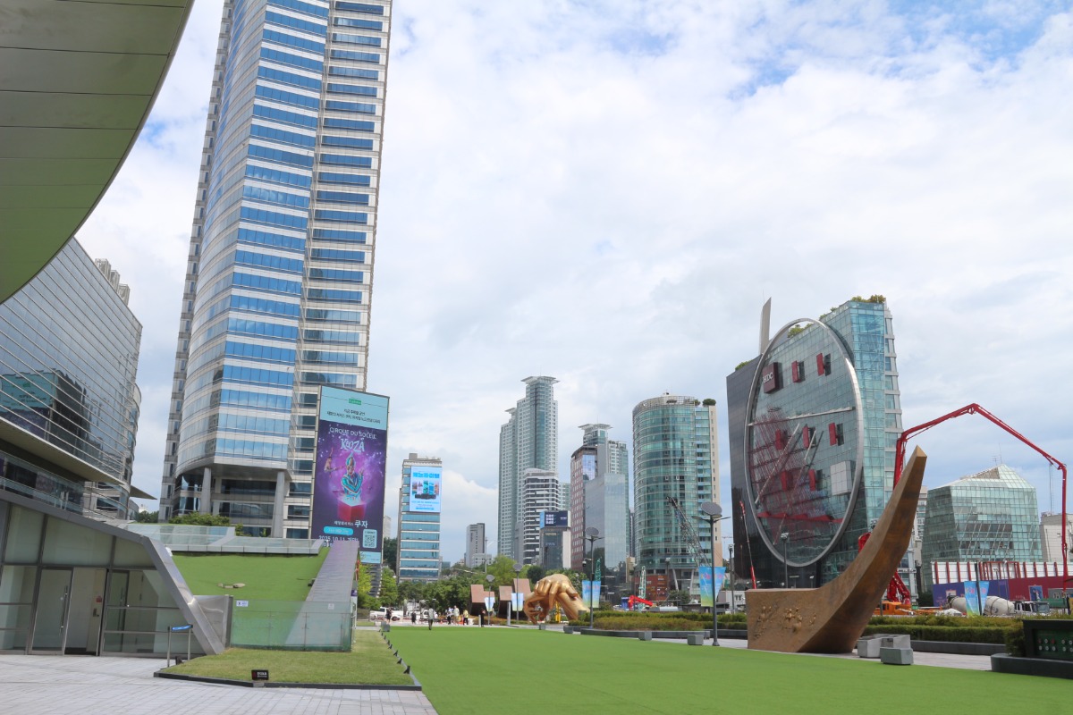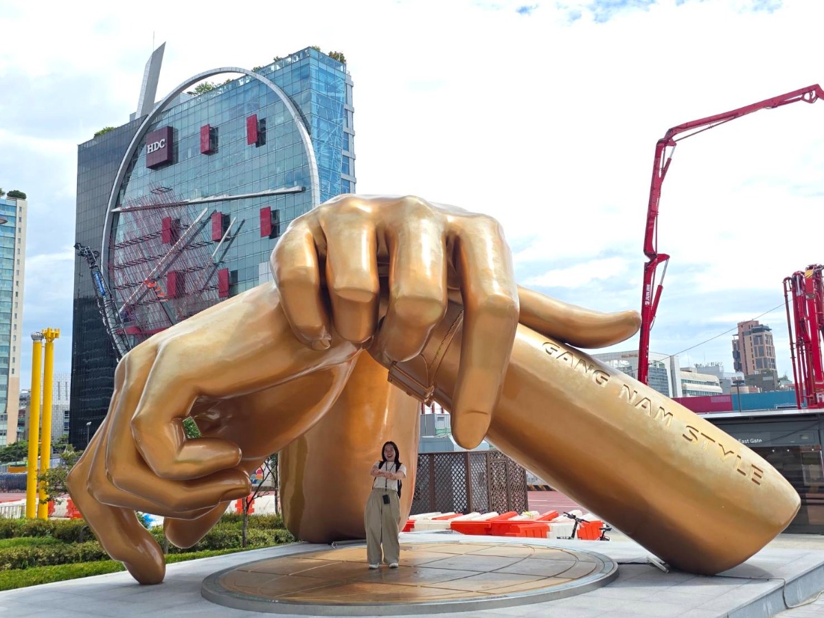 大型複合施設「コエックスモール」の近くで、高さ約5mにも及ぶ、手の形をした黄金像を見つけました。モデルは、言わずと知れた「江南スタイル」の乗馬ダンス! 備え付けのカメラ台もあるので、手の下に入って記念撮影しましょう!