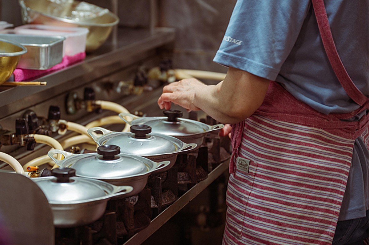 たくさんのアルミ鍋が並ぶ、この店ならではの景色。一つひとつ直火でグツグツと煮込まれる