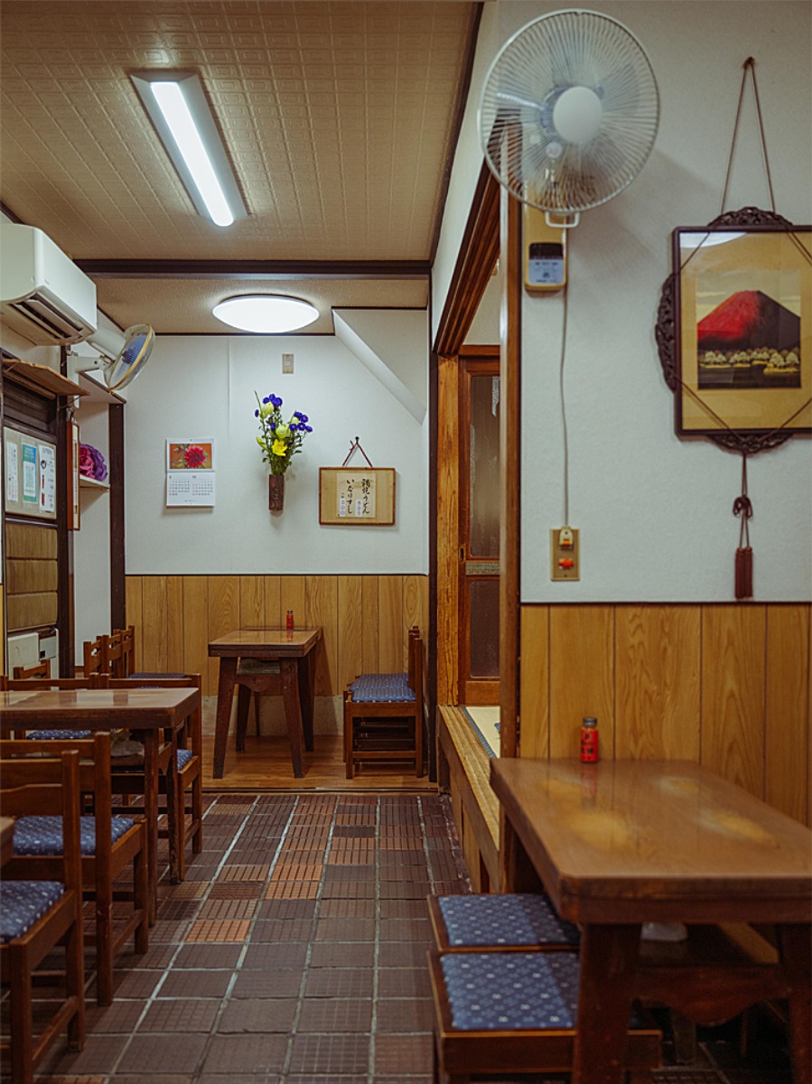 小上がりの座敷とテーブル席が並ぶ店内。木の温もりに包まれた、昔ながらの趣が漂う