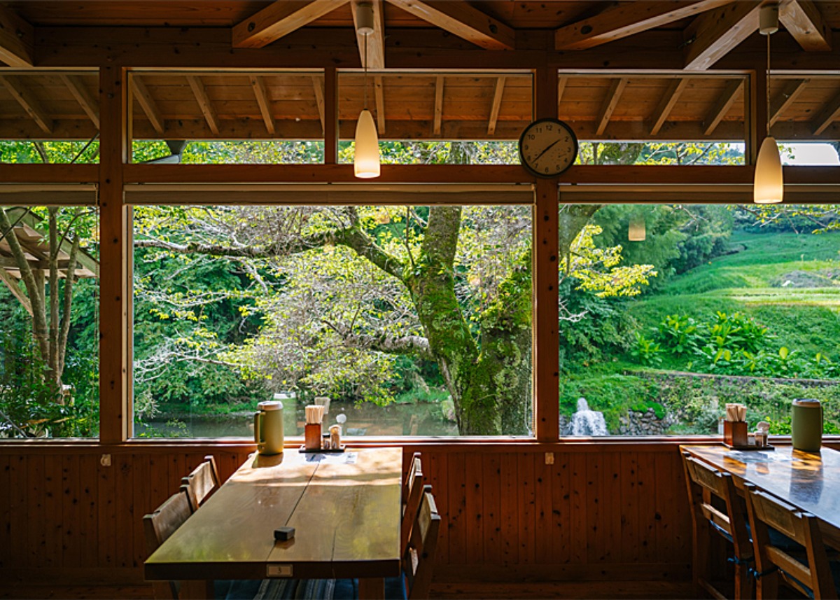 そのほとりに佇むのは、愛犬と一緒に過ごせるテラス席もあり、山里の自然を満喫できるうどん店「かじか亭」。
